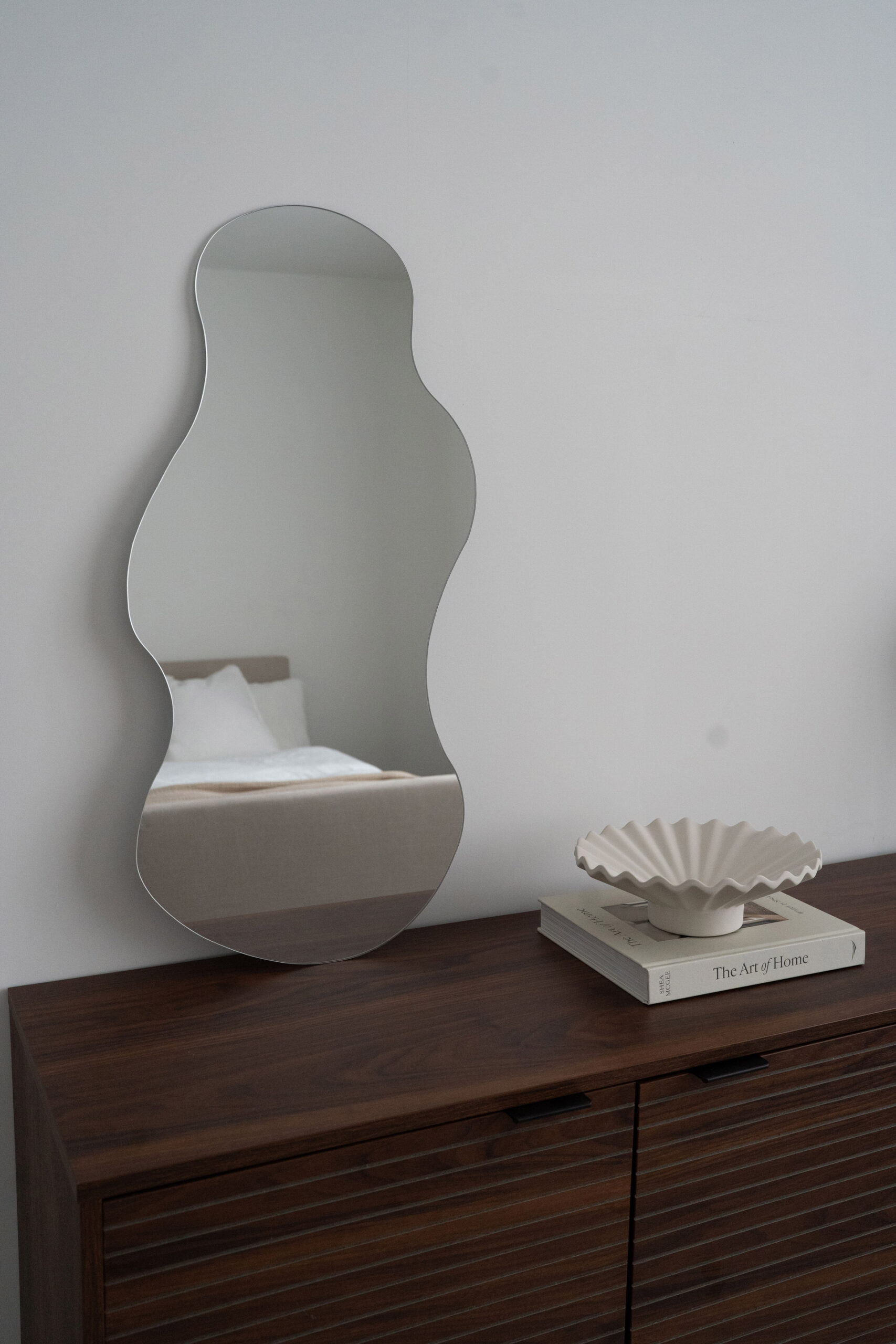This organic-shaped mirror, inspired by natural curves, breaks away from the ordinary to